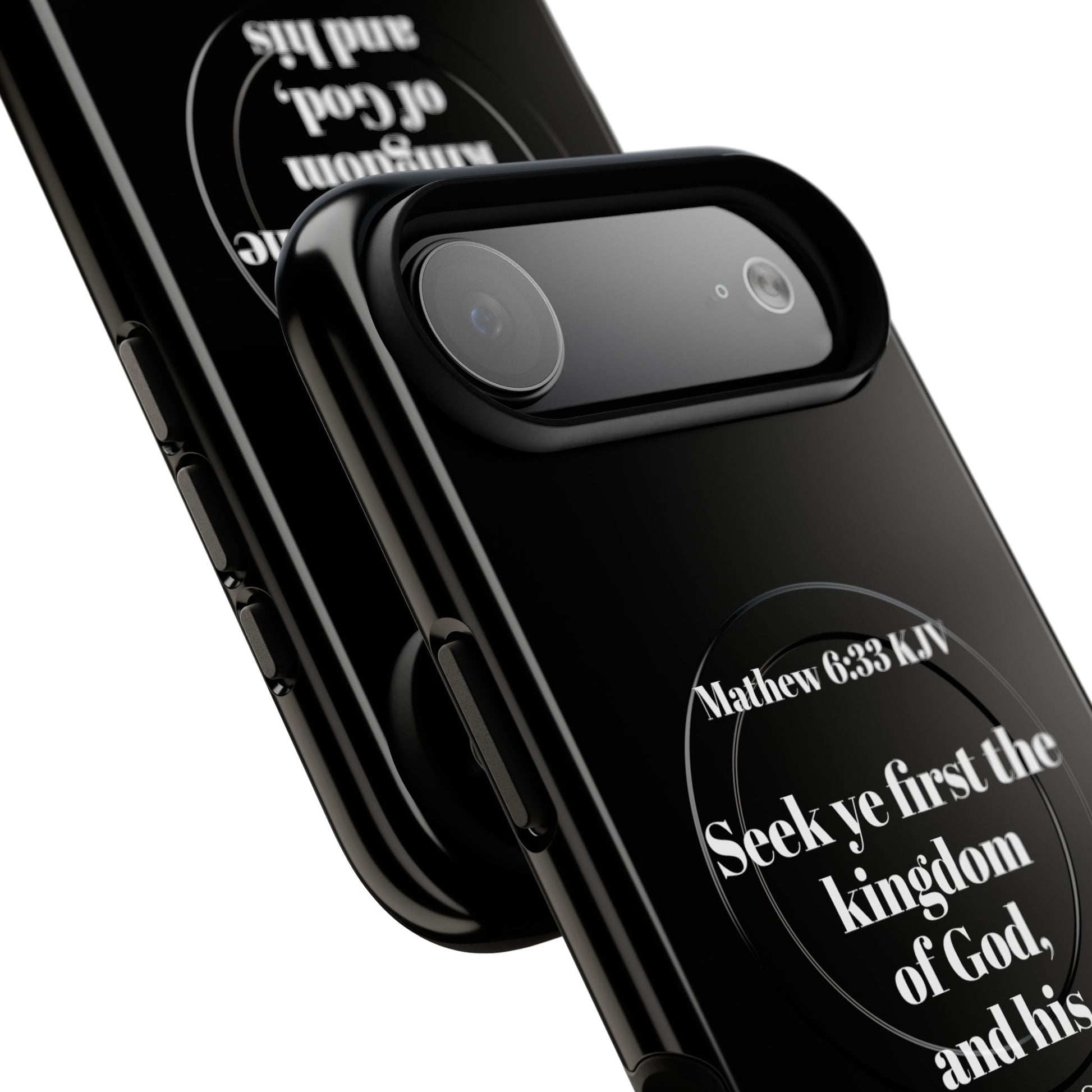 This slim, tough magnetic phone case brings faith into daily carry with confident clarity. A glossy black background makes the white scripture text stand out — a modern, minimal presentation of Matthew 6:33 (KJV) that reads like a quiet reminder each time you reach for your phone. The dual-layer build and TPU silicone liner absorb shocks while the MagSafe-compatible magnetic module keeps your charging and accessories hassle-free. It’s a piece that lives on your pocket or countertop, steadying small moments with a simple, spiritual prompt.