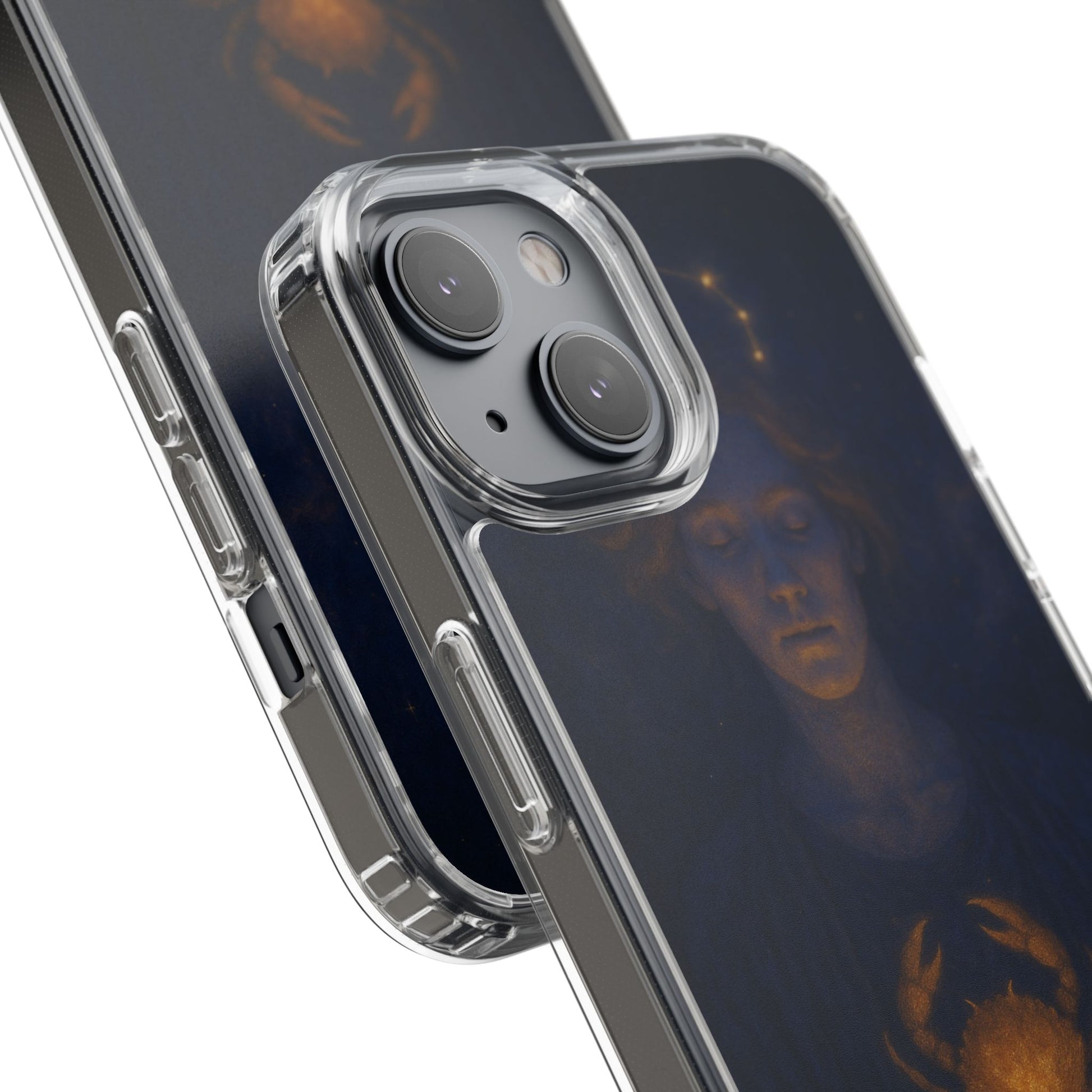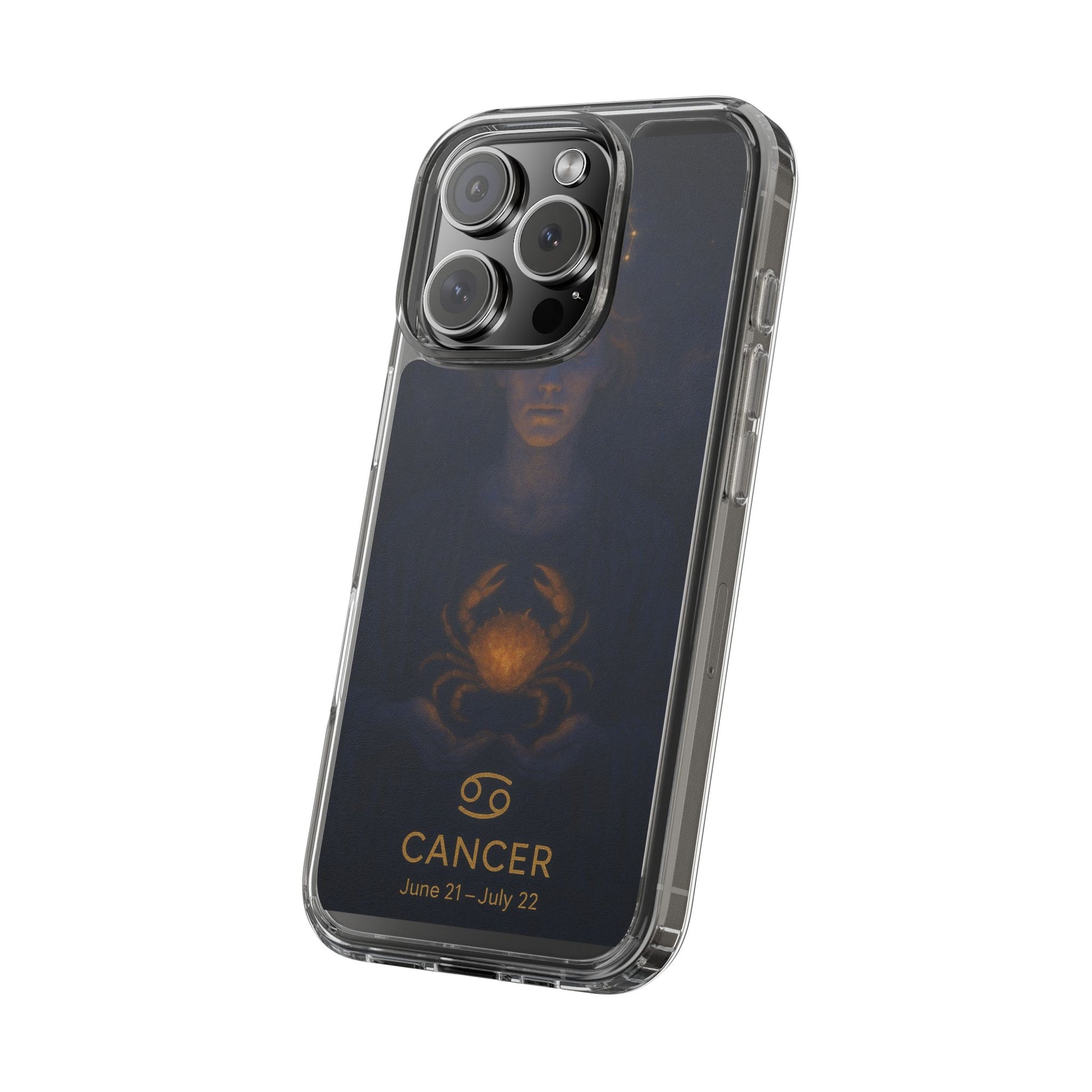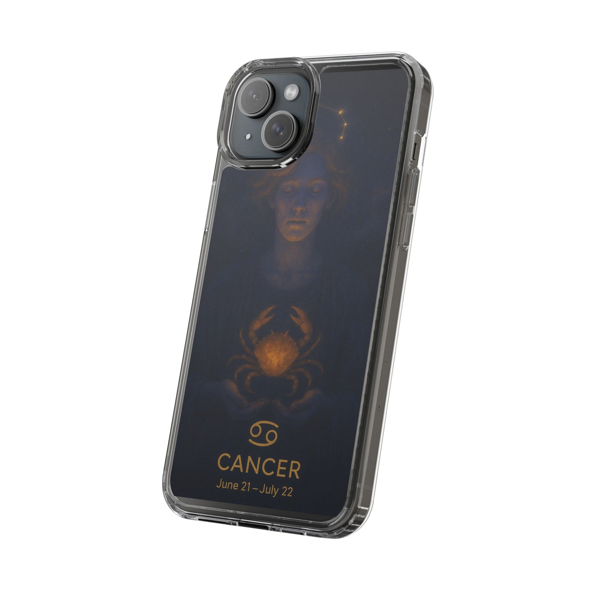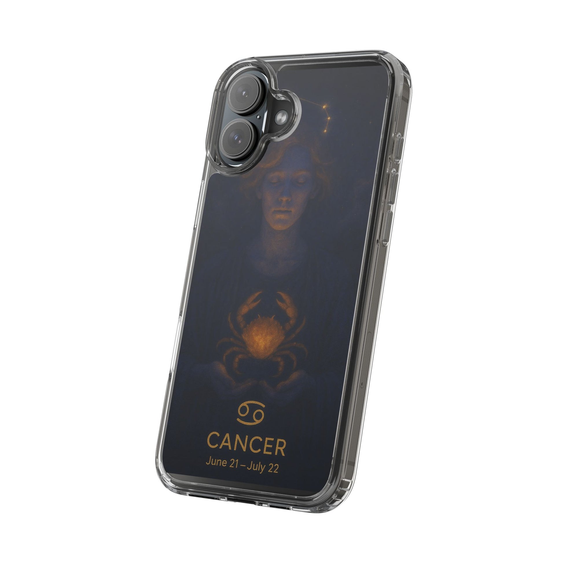 A clear, slim phone case that lets your phone’s own color shine through while adding protective strength and celestial style. The translucent polycarbonate back and TPU sides create a barely-there fit that soaks up shocks and resists scratches. Printed with a moody, star-lit Cancer zodiac illustration in deep navy and warm gold tones, this case feels like a quiet talisman — intimate, contemplative, and a subtle nod to astrological identity. Lightweight and precise, it keeps all ports and buttons accessible, supports wireless charging, and arrives with optional gift packaging on select models.