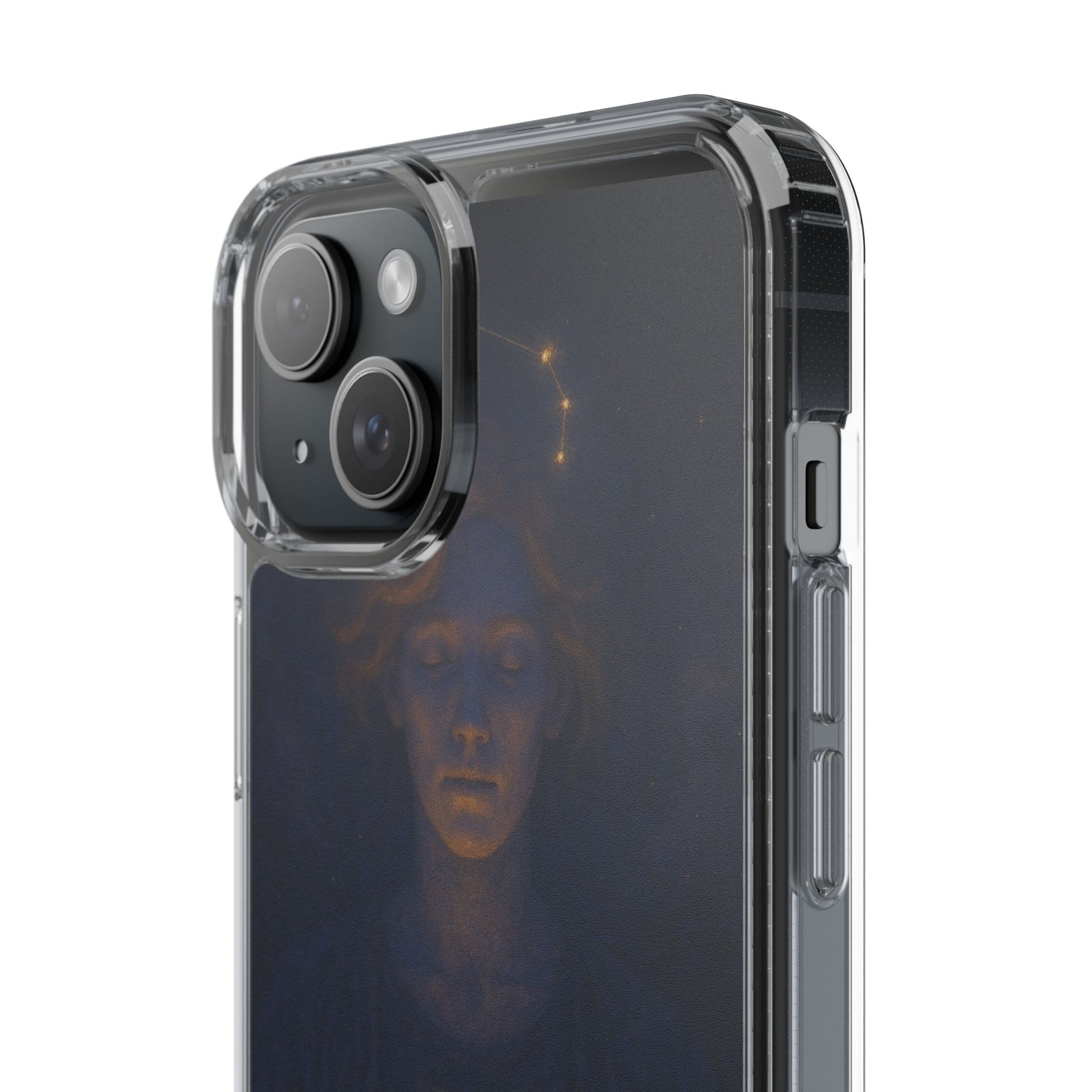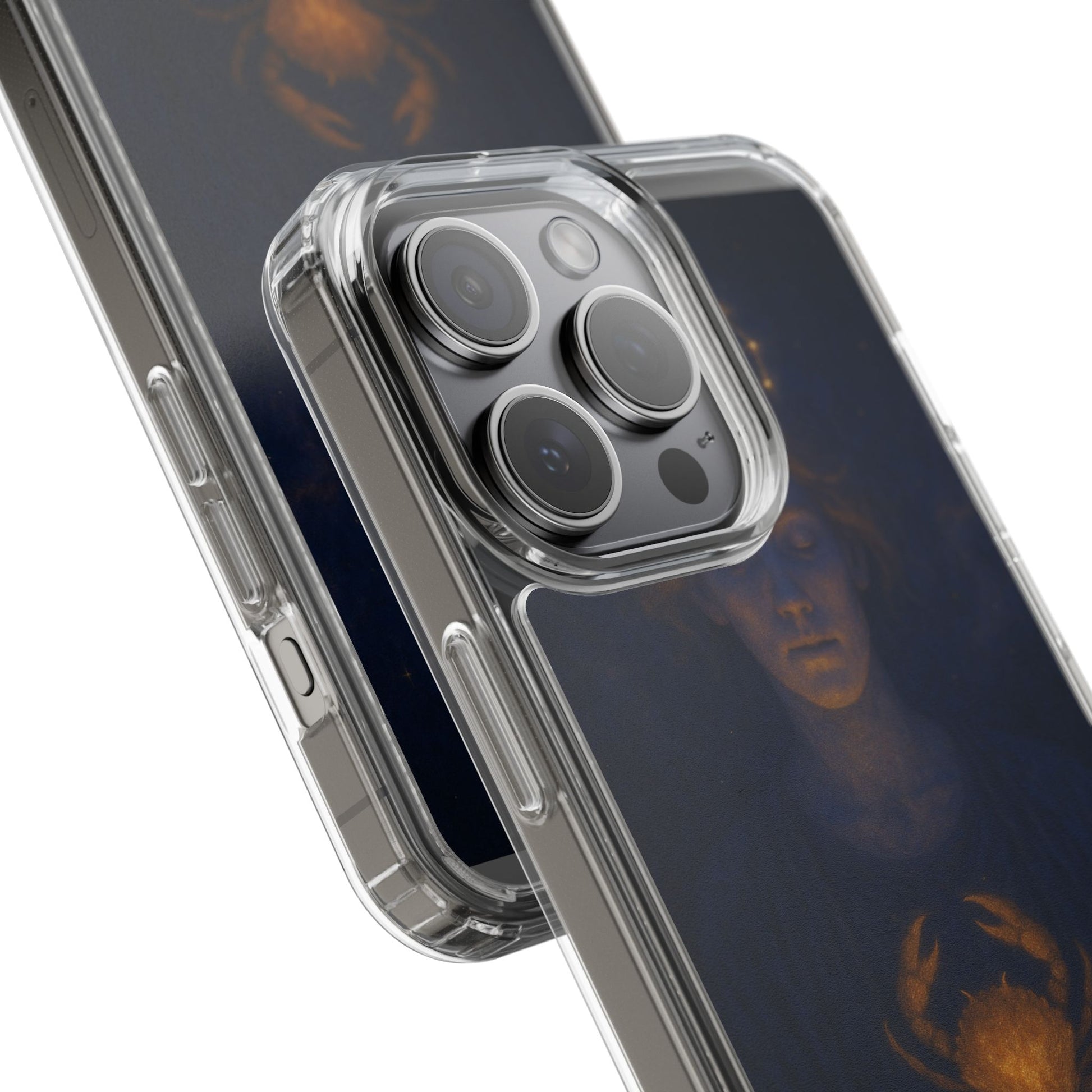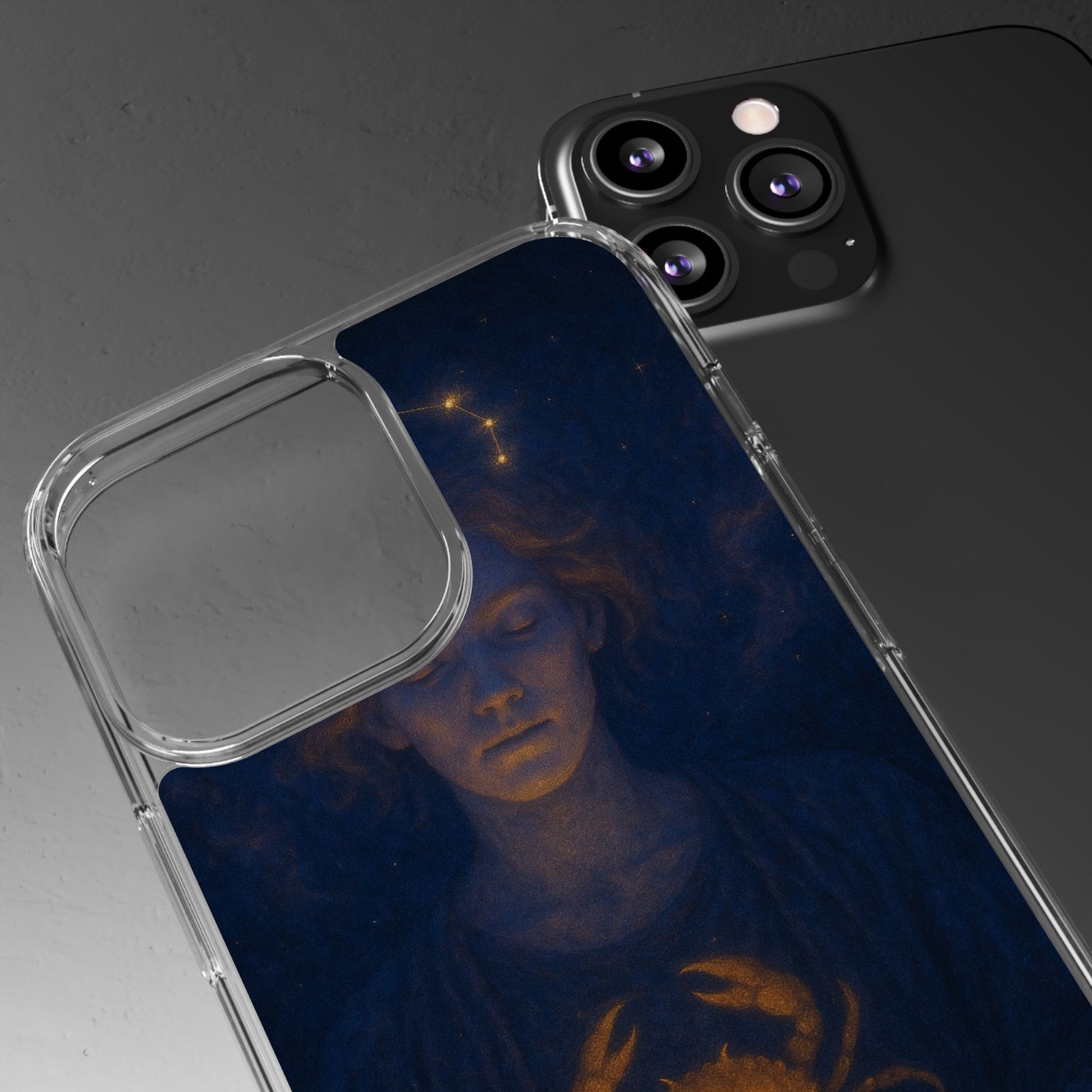 A clear, slim phone case that lets your phone’s own color shine through while adding protective strength and celestial style. The translucent polycarbonate back and TPU sides create a barely-there fit that soaks up shocks and resists scratches. Printed with a moody, star-lit Cancer zodiac illustration in deep navy and warm gold tones, this case feels like a quiet talisman — intimate, contemplative, and a subtle nod to astrological identity. Lightweight and precise, it keeps all ports and buttons accessible, supports wireless charging, and arrives with optional gift packaging on select models.