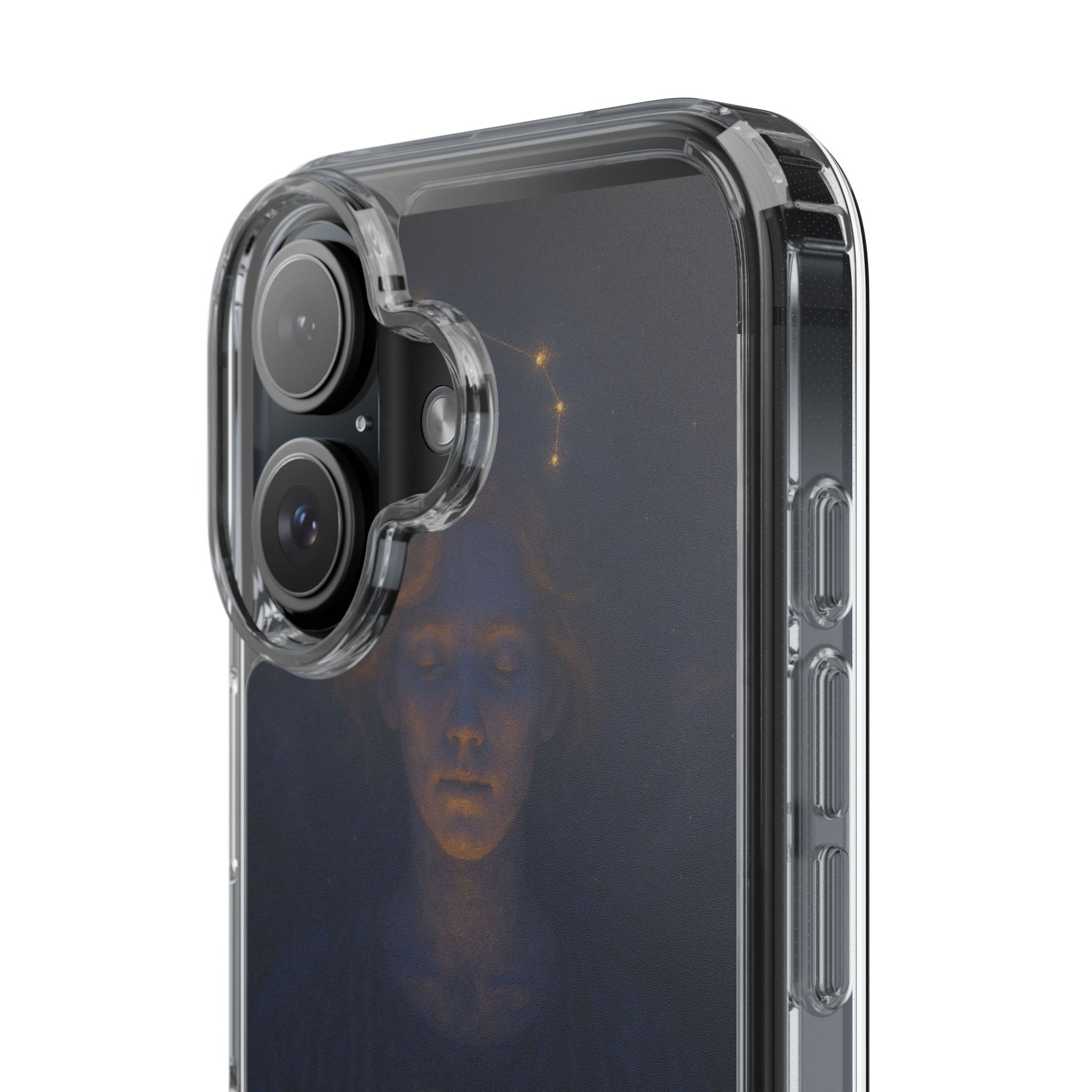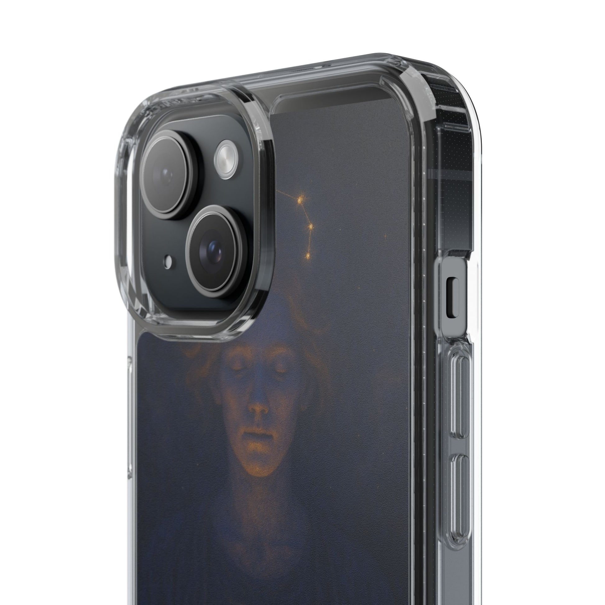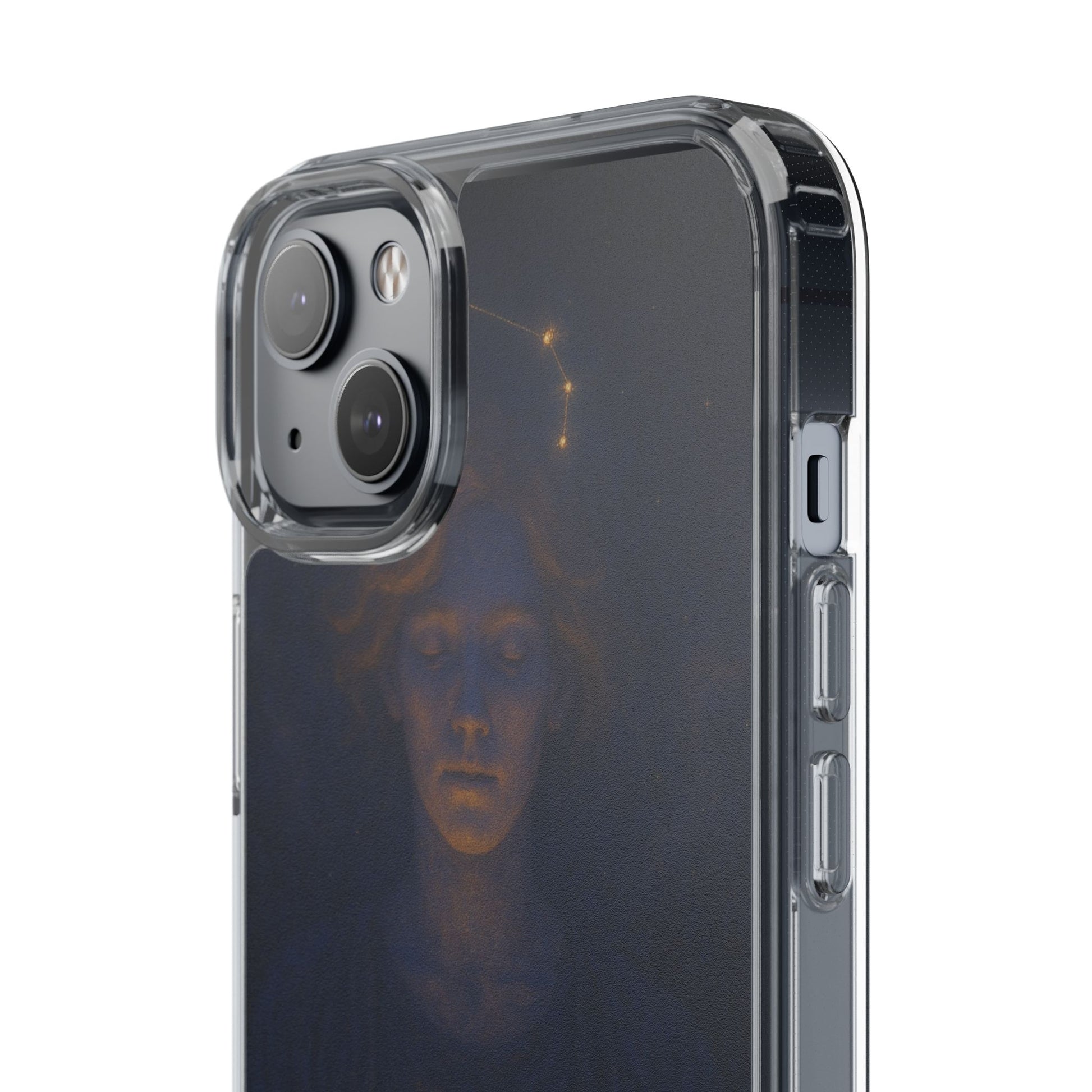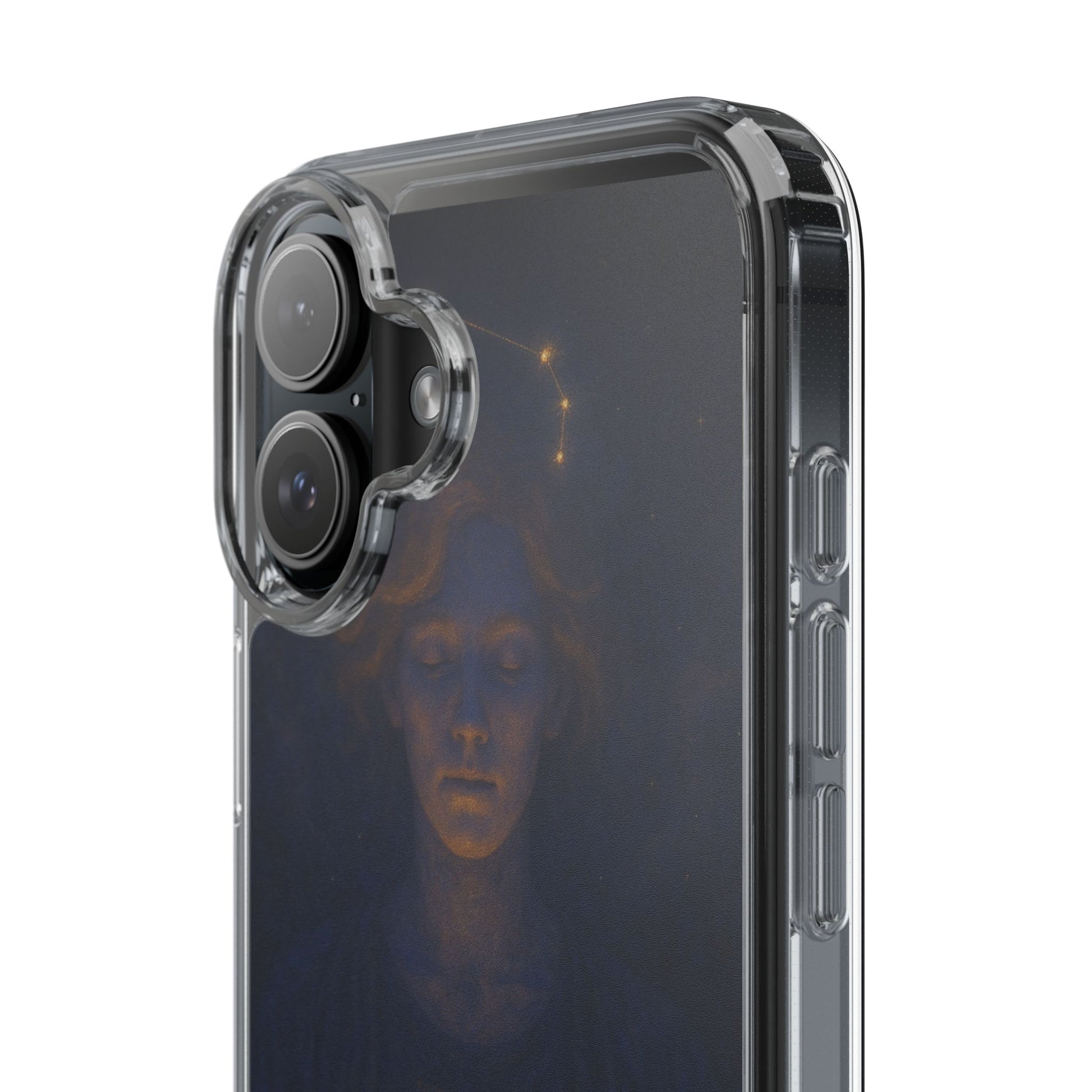 A clear, slim phone case that lets your phone’s own color shine through while adding protective strength and celestial style. The translucent polycarbonate back and TPU sides create a barely-there fit that soaks up shocks and resists scratches. Printed with a moody, star-lit Cancer zodiac illustration in deep navy and warm gold tones, this case feels like a quiet talisman — intimate, contemplative, and a subtle nod to astrological identity. Lightweight and precise, it keeps all ports and buttons accessible, supports wireless charging, and arrives with optional gift packaging on select models.